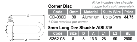 Miami Stainless Corner Disc 90mm with 8mm Long Dee Shackle allows our existing 90mm aluminium corner disc to be fixed on the same plane as the shade structure membrane and reduced the need for tensioner at some fixing points. Corner disc suits wire up to 6mm.