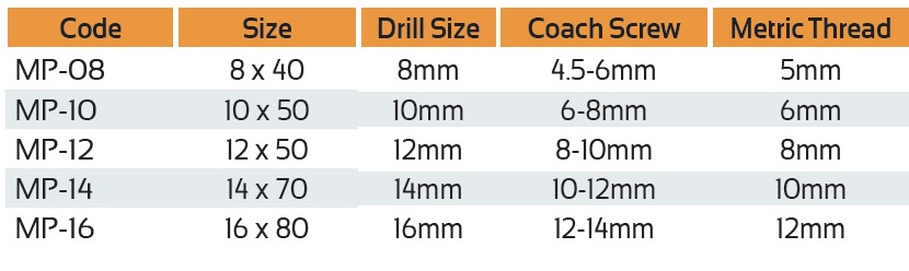 Miami Stainless Mungo Nylon Plugs are for use in concrete, natural stone, brick, sand stone and gypsum. Mungo Plugs suit a Coach Screw. Simply drill the recommended hole insert the plug and screw in the fitting. For use in solid cores such as concrete, natural stone and brick.