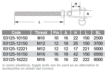 Miami Stainless Toggle Bolts are high quality AISI 316 marine grade stainless steel specifically designed for use with 90mm Corner Discs, ProRig Ezi-Hold Dee Rings with Pipe or fasten directly through a shade structure posts. Miami Stainless Toggle Bolts can be fastened to most stainless steel fittings including Wall Plates, Eye Bolts or Corner Brackets.