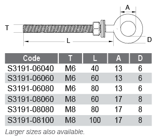 Miami Stainless Welded Eye Bolts are made from high quality forged AISI 316 Marine Grade stainless steel and comes with stainless steel nut and two stainless steel washers. They are specifically designed to screw into internal threaded holes including Blind Nut Rivets, or Nutserts. Miami Stainless Welded Eye Bolts come in a range of metric sizes and are electro polished for a superior finish.